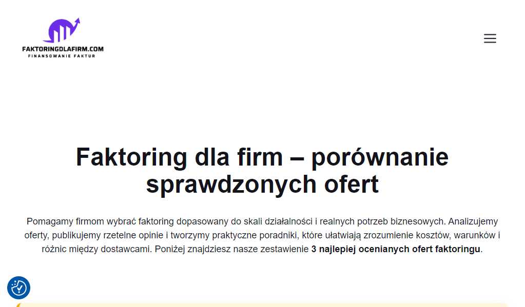 Faktoringdlafirm.com to serwis, który pomaga przedsiębiorcom znaleźć najlepsze rozwiązania finansowe dopasowane do potrzeb działalności. Na stronie można szybko sprawdzić aktualne oferty faktoringu, porównać koszty oraz wybrać najkorzystniejsze warunki współpracy.Faktoring dla firm – szybki dostęp do gotówkiFaktoring dla firm to rozwią